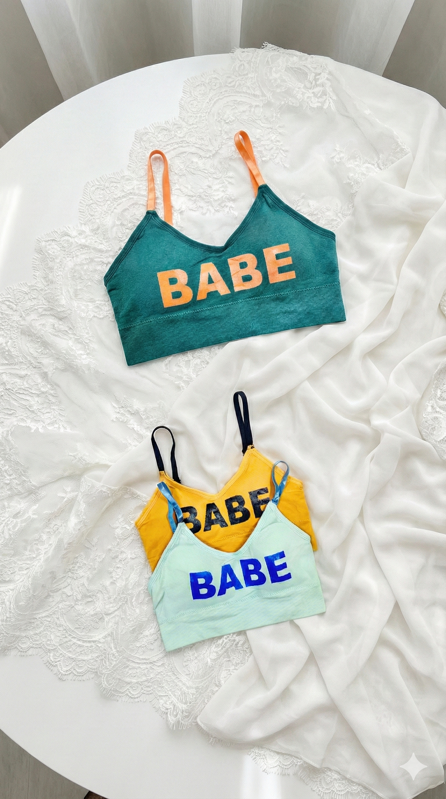 seamless ribbed bralette features contrasting gold straps and a metallic "BABE" print for a standout look.